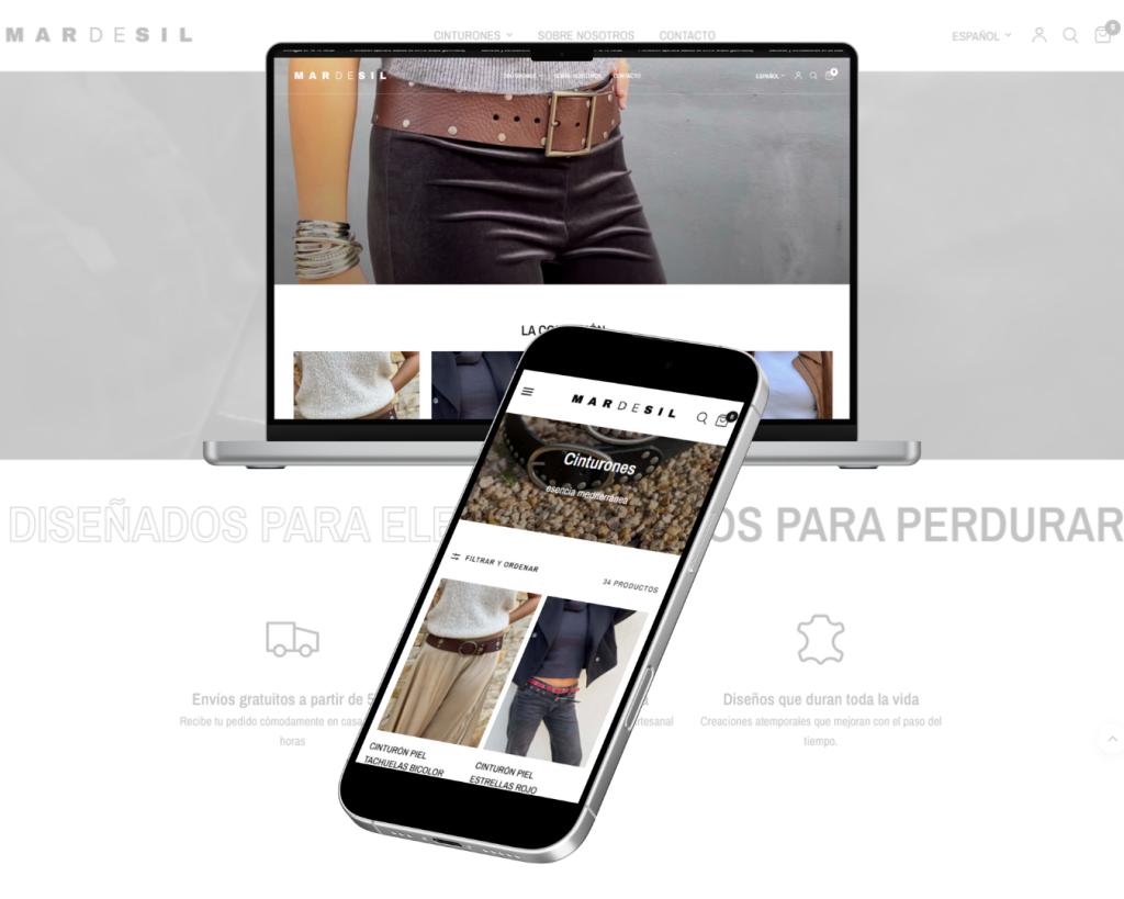 Diseñamos una interfaz visualmente limpia que pone el foco en el detalle artesanal de sus cinturones, organizando el catálogo de forma intuitiva.